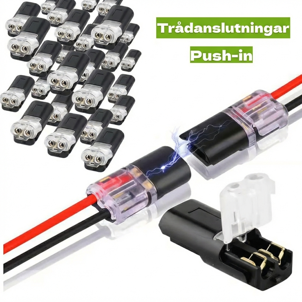 De fungerar med vanliga 2-ledarkablar för lågspänning, t.ex. LED-belysning (12V/24V) och mindre elprojekt. Kontrollera att kabelns diameter matchar produktens specifikation.